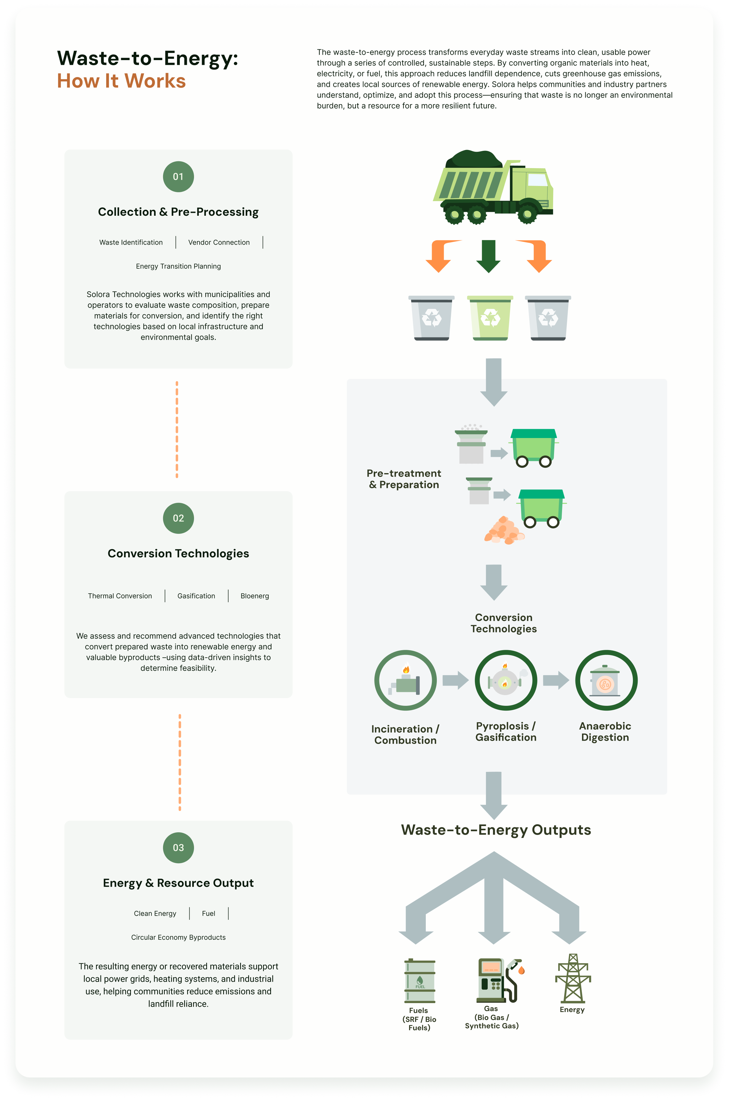 To support understanding and establish credibility, I designed a custom waste-to-energy process diagram that clearly outlines each stage of the system. I created the vectors from scratch and structured the flow to make a complex process approachable for visitors who may be unfamiliar with waste-to-energy concepts. While the client valued having a diagram, they had not yet seen one that felt right, so I focused on a visual style that aligned with Solora’s updated brand colors and positioning. The result was an engaging, informative diagram that reinforces Solora’s expertise without feeling overly clinical or “cartoony”.