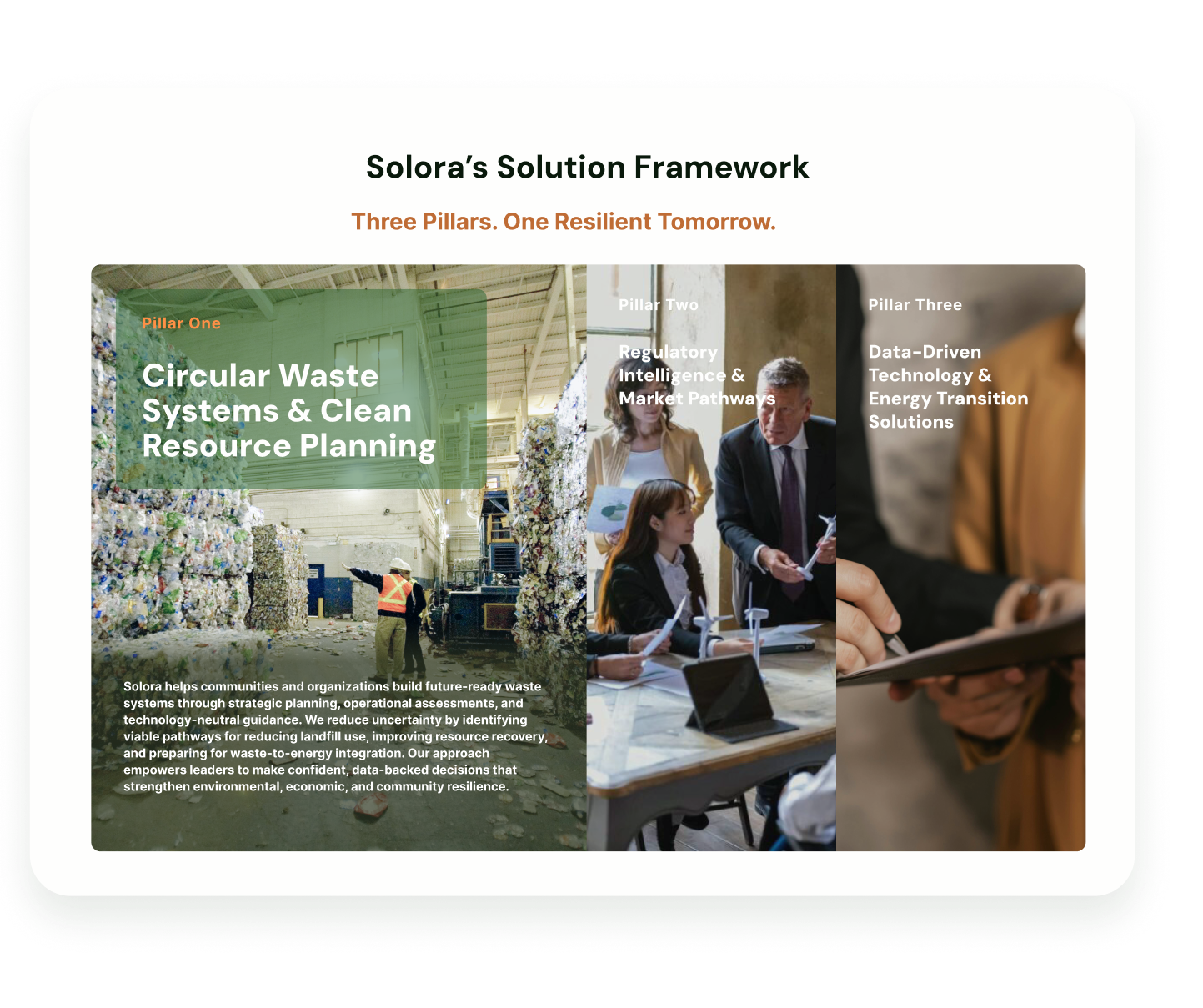 The site guides users through Solora’s process by aligning content structure with how environmental and waste-to-energy projects are evaluated in practice. The homepage establishes context by acknowledging common challenges such as landfill capacity constraints, regulatory complexity, and uncertainty around viable pathways. This framing demonstrates problem understanding before proposing solutions.