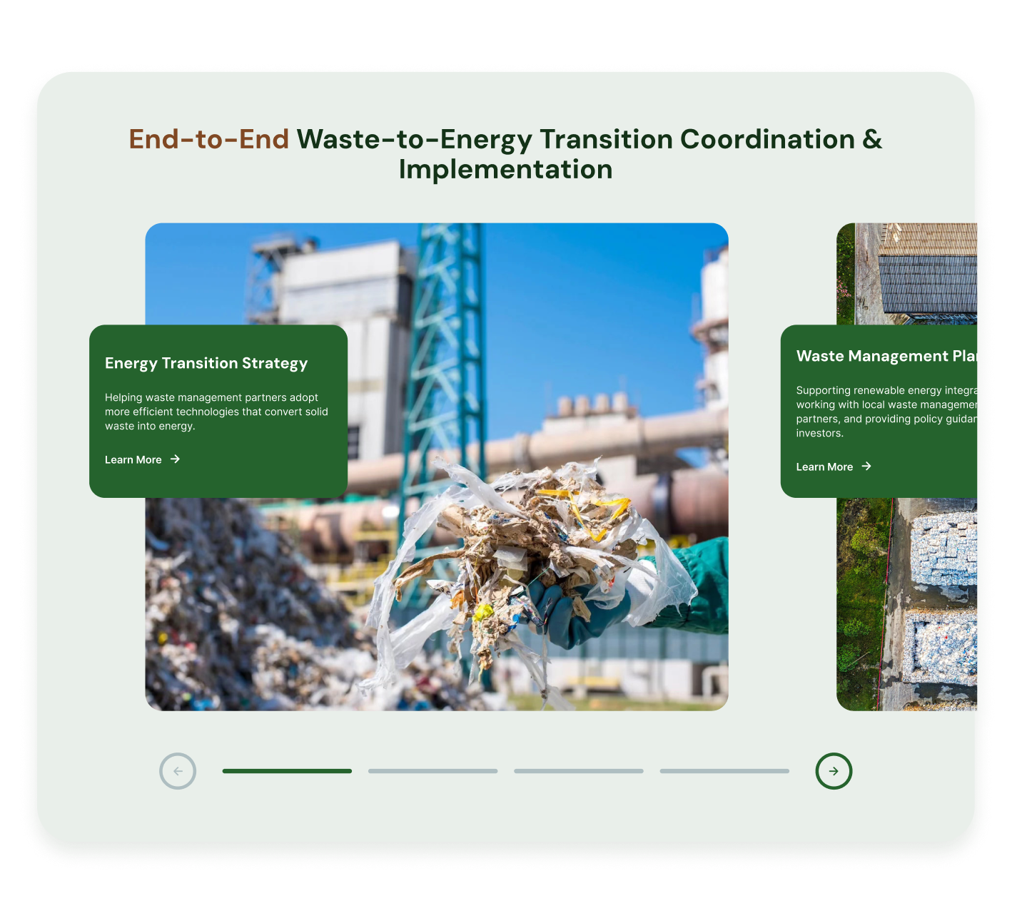 Balancing technical accuracy with accessibility was a central design challenge. Rather than oversimplifying, complexity was structured through progressive disclosure, clear hierarchy, and visual explanation. Step-by-step diagrams translated complex waste-to-energy systems into shared reference points for mixed technical and non-technical audiences. Supporting copy used plain language and outcome-focused framing, preserving rigor through logic and sequencing rather than jargon.