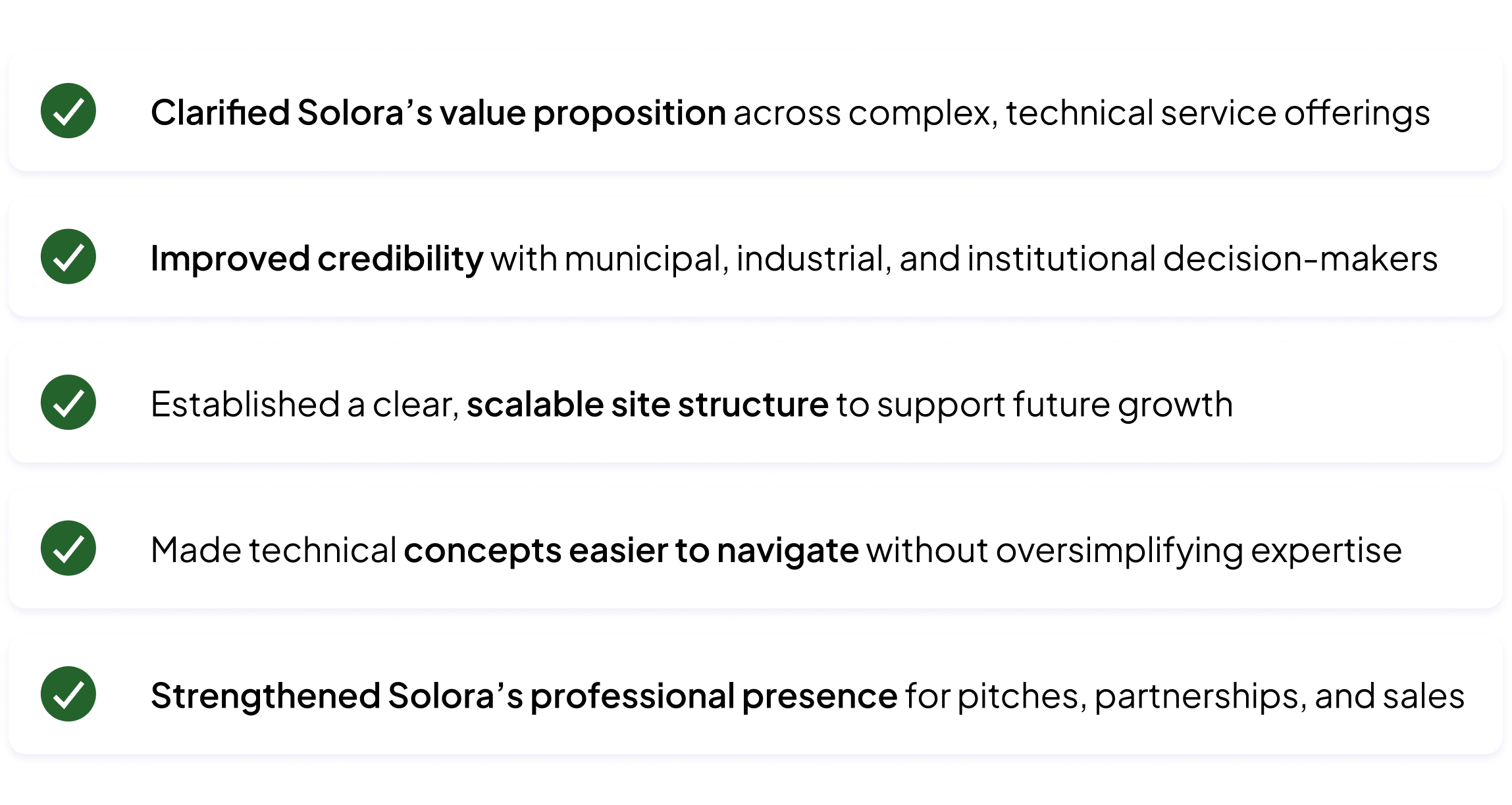Qualitatively, the redesign aligned the Solora team around a shared narrative and language for their services. Externally, the site is now ready to be used confidently in investor outreach, municipal discussions, and partnership conversations—serving as both a credibility signal and an educational tool. The modular structure supports scalability as Solora releases reports, expands partnerships, or introduces proprietary technology.